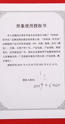 “牡丹花”“怡飾家”品牌是公司主營的注冊商標(biāo),并與明星句號達(dá)成合作。14年的板材專業(yè)精神和持續(xù)穩(wěn)健的行業(yè)資源優(yōu)化整合。